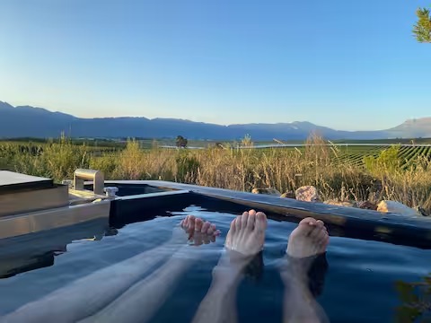 A rustic, off-grid, sandbag-constructed house situated on a beautiful fruit farm in the Ceres valley. Magical views of the surrounding mountains and orchards. Private and peaceful with perfect sunrises and sunsets from the wrap-around deck with a hot tub, all nestled in natural Fynbos surrounds.